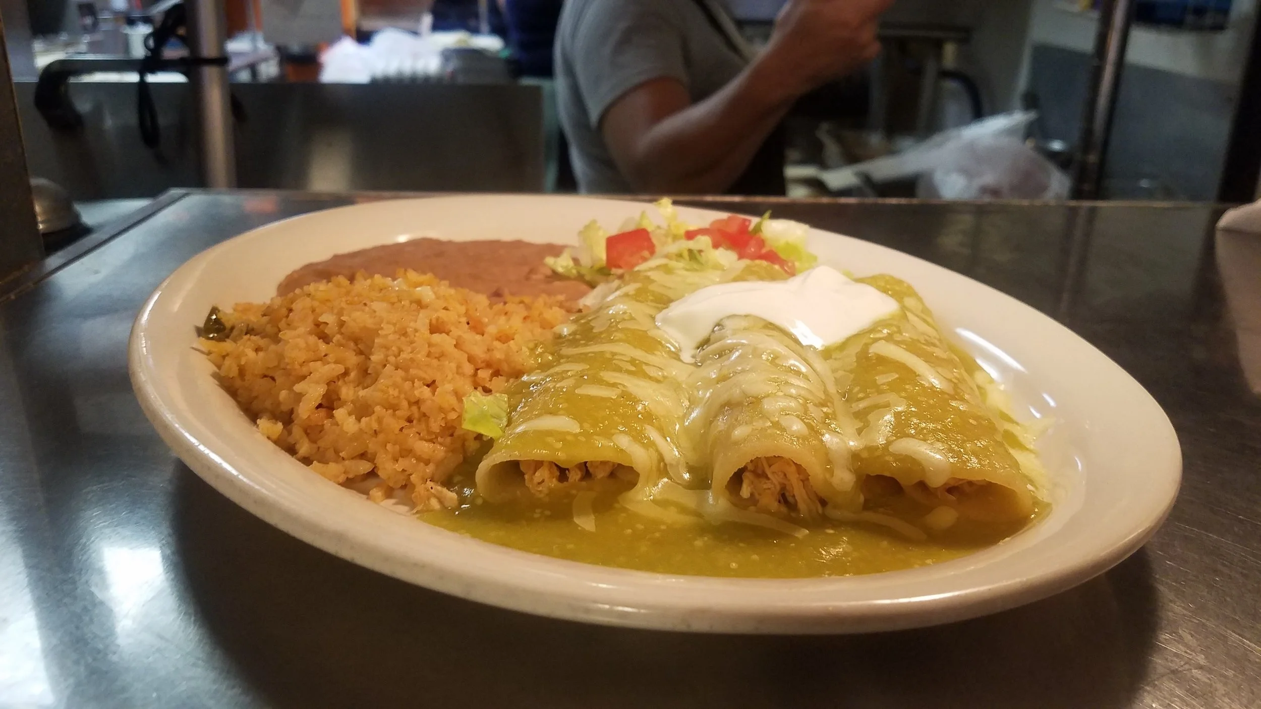 Three Chicken Enchiladas with Tomatillo Sauce, Monterrey Cheese, Sour Cream, Rice, and Beans